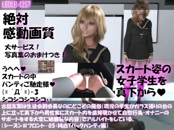 【●100△100】古舘友梨は生徒会副会長なのにどこぞの風俗(現役の学生がガラス張りの台の上に立って真下から男性客にスカート内を直接覗かせて自慰行為・オナニーのサポートをする大変に破廉恥な内容)でアルバイトをしている。(シーズンIII-05:純白Tバックパンティ編)