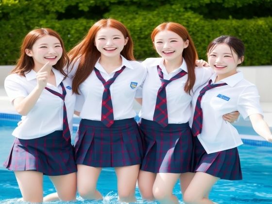 と校内プールサイドへ行った制服女子たち。