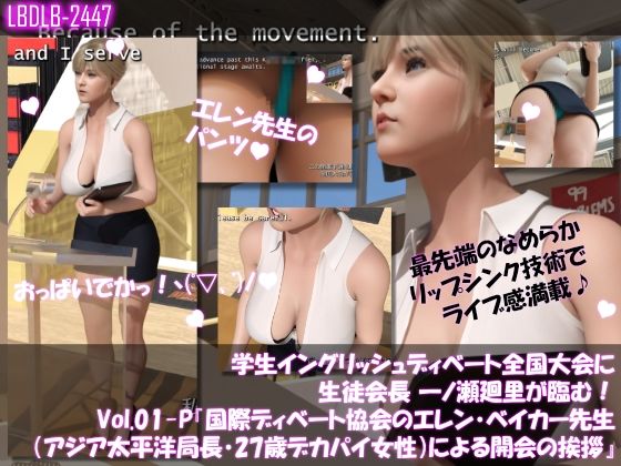 廻里は学校で生徒会長をしています。そしてなんと!在学中にTOWIC(トーウィックという英語の資格試験)でスコア830点、外資系のビジネスユースケースでも充分に対応可能というトンデモナイ英会話能力を持っています(笑)彼女の学校は実の所、毎年夏に行われている全国ディベート大会全国大会の常連で、昨年に引き続いて今年も県大会を勝ち進んで関東ブロック大会に臨んでいます。開会の挨拶を、国際ディベート協会・アジア太平洋局長・27歳の超絶才女のエレン・ベイカー先生が務めます。オッパイが大きく(推定Gカップ)さらに胸の谷間全開★の彼女は、真面目な話をしていてもフェロモンムンムンです’`ァ’`ァ (〃´Д`〃) これでエロい目で見るなと言うほうがムリです(笑)